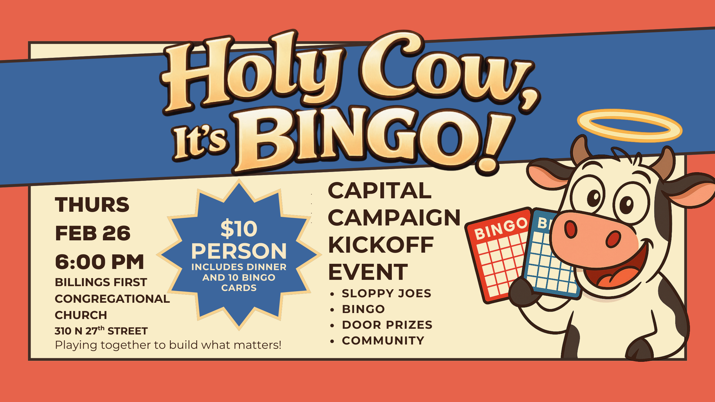 Get ready for a night of fun, food, and fellowship! Holy Cow, It’s Bingo! is coming up, and everyone’s invited. Family, friends, and neighbors! We’ll have sloppy joes, chips, and refreshments ready for you — plus plenty of bingo and prizes. Come enjoy a joyful night with your church family! Pre-register to save your spot!